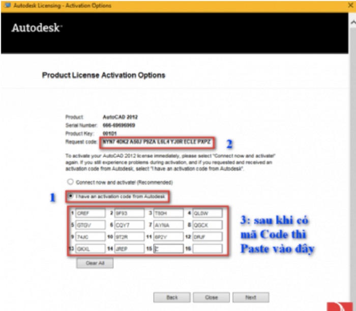 - Bước 4: Trên AutoCAD 2012, bạn tích vào I have an activation code from Autodesk và Copy Request code.