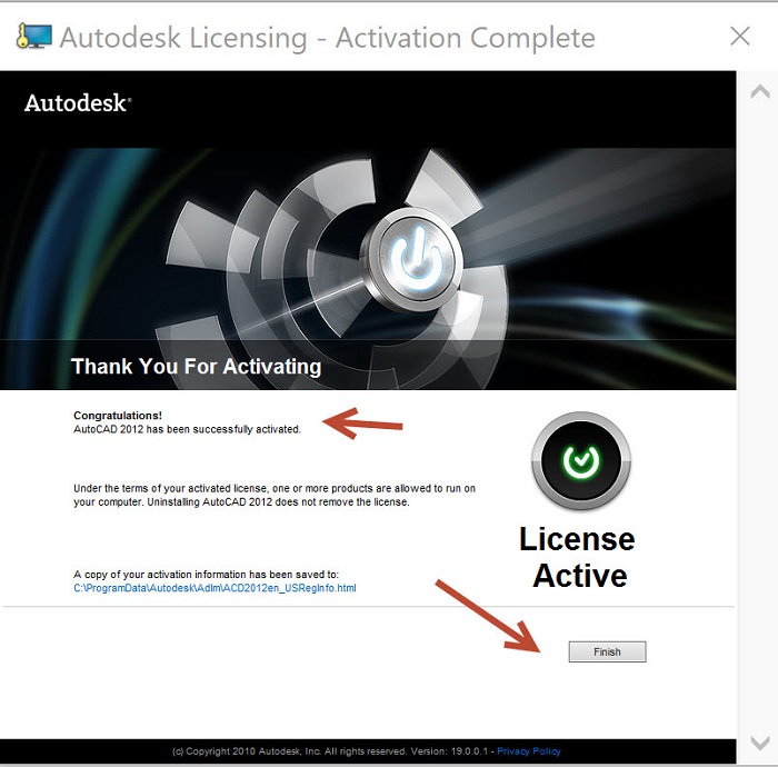 - Bước 6: Kích hoạt AutoCAD 2012 thành công, màn hình hiện Thank You For Activating, bạn nhấn Finish.