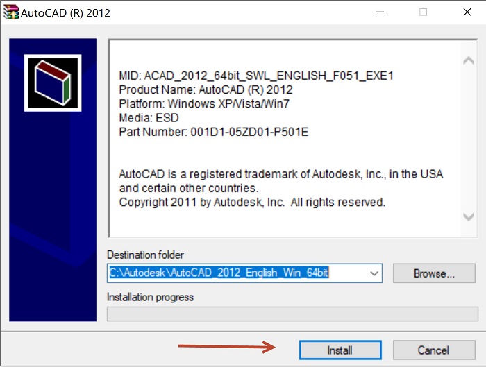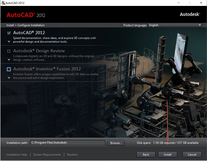 - Bước 5: Chỉ chọn AutoCAD 2012 (bỏ tick các mục khác) để cài nhanh và gọn, rồi bạn nhấn Install.