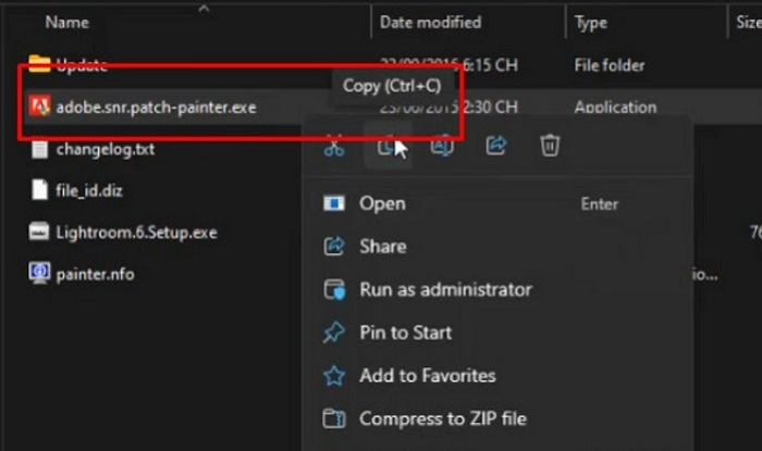 • Bước 1: Bạn mở thư mục kích hoạt, copy file adobe.snr.patch-painted.exe.
