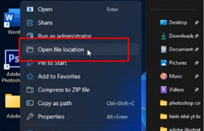 • Bước 2: Bạn nhấn chuột file vào icon công cụ và chọn Open file location.